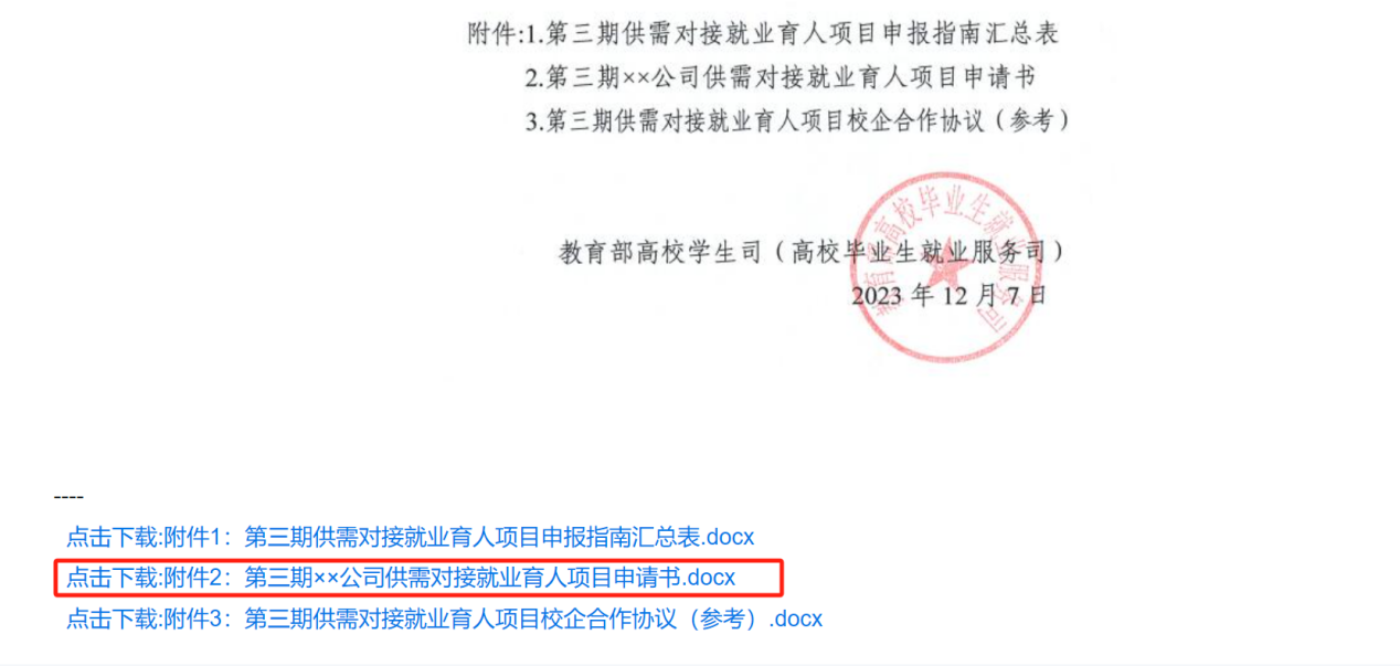点击《关于公布第三期供需对接就业育人项目申报指南的函》网页底部附件链接,下载“第三期××公司供需对接就业育人项目申请书”。