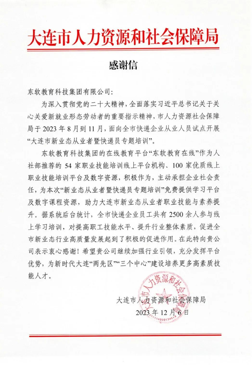 近期,大连市邮政管理局、大连市人力资源和社会保障局分别发来感谢信,对PA视讯国际教育科技集团在“大连市新业态从业者暨快递员专题培训”中,认真落实指示精神、悉心筹备培训工作,圆满完成本次培训任务表示衷心的感谢。