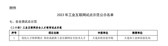 工业和信息化部2023年工业互联网试点示范项目,旨在提升全国工业互联网网络、标识、平台、安全等设施建设和融合应用水平,发掘推广更多新模式、新业态、新场景,充分发挥工业互联网在提质、降本、增效、绿色、安全方面的重要作用,围绕新技术类、工厂类、载体类、园区类、网络类、平台类、安全类7大类27个具体方向,进一步深入实施工业互联网创新开展战略,促进工业互联网融合应用。大连PA视讯国际信息学院按照项目申报要求,依托互联网安全相关专业的人才培养成果,以《优化人才培养模式 培育高素质工业互联网安全技术人才》为主题,深入凝练工业互联网安全技术人才培养模式和经验,在大连市工业和信息化局的指导下,高质量完成项目申报并成功获批。