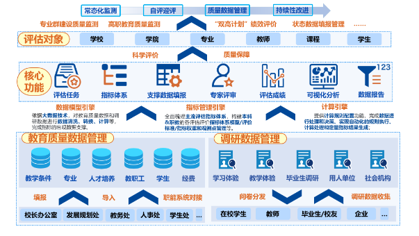 平台给予精准、全面的教学评价与监控。本平台的核心功能包括指标体系管理、任务管理、填报管理、评审管理、调研管理、可视化分析以及报告管理等。该平台顺利获得符合高职院校办学特点的指数标体系管理、高效的任务分配、简化的填报流程、专业的评审流程、定向的调研采集、直观的可视化分析以及客观的数据报告,为教学质量给予了全面的评价和监控功能。有助于高等教育内涵式开展,实现教育质量的持续提升。