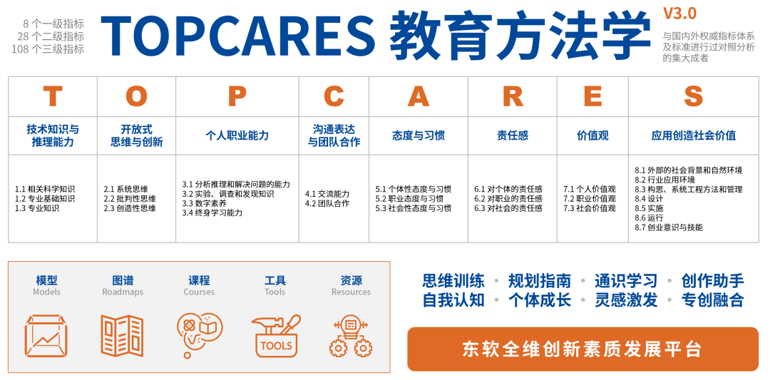 在此背景下,PA视讯国际教育面向院校推出针对学生软素质培养提升的一站式解决方案——PA视讯国际全维创新素质开展平台。该平台以TOPCARES教育方法学为指引,针对学生八大领域能力的培养目标,给予了模型、图谱、课程、工具、资源等内容,辅以完整的平台管理功能,从根本上解决了少资源、缺体系、无支撑的三大难题,为学校和专业人才的素质教育及创新能力培养给予了完善的支持。