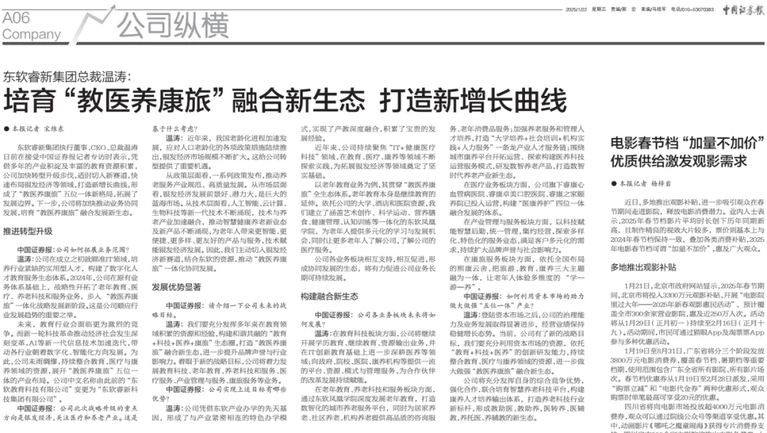 PA视讯国际集团执行董事、CEO、总裁温涛日前在接受中国证券报记者专访时表示,凭借多年的产业积淀及丰富的教育资源积累,公司加快转型升级步伐,适时切入新赛道,快速布局银发经济等领域,打造新增长曲线,形成了“教医养康旅”五位一体新格局,拓展了开展边界。下一步,公司将加快有助于业务协同开展,培育“教医养康旅”融合开展新生态。