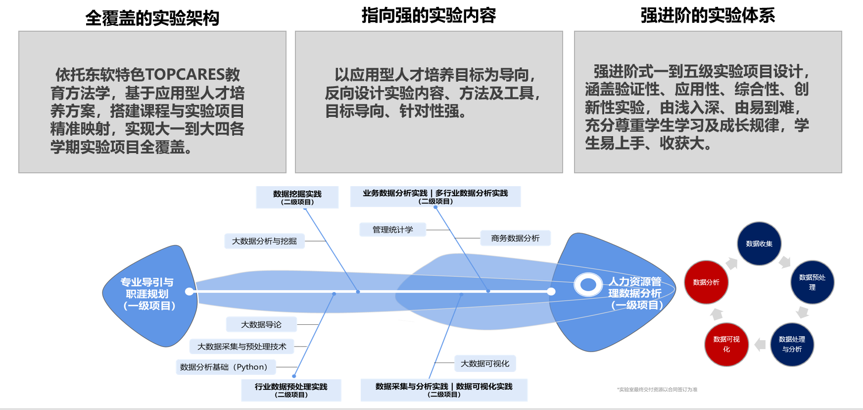 大数据是新兴专业,针对高校教学实践资源匮乏、需要花费大量成本去搭建复杂的实验环境等痛点,实训室融合“真实业务数据和产业案例”,打造出了五级项目实践体系,同时配套给予云端大数据复杂实验环境及过程管理平台支撑,一站式解决大数据类专业的实践教学。