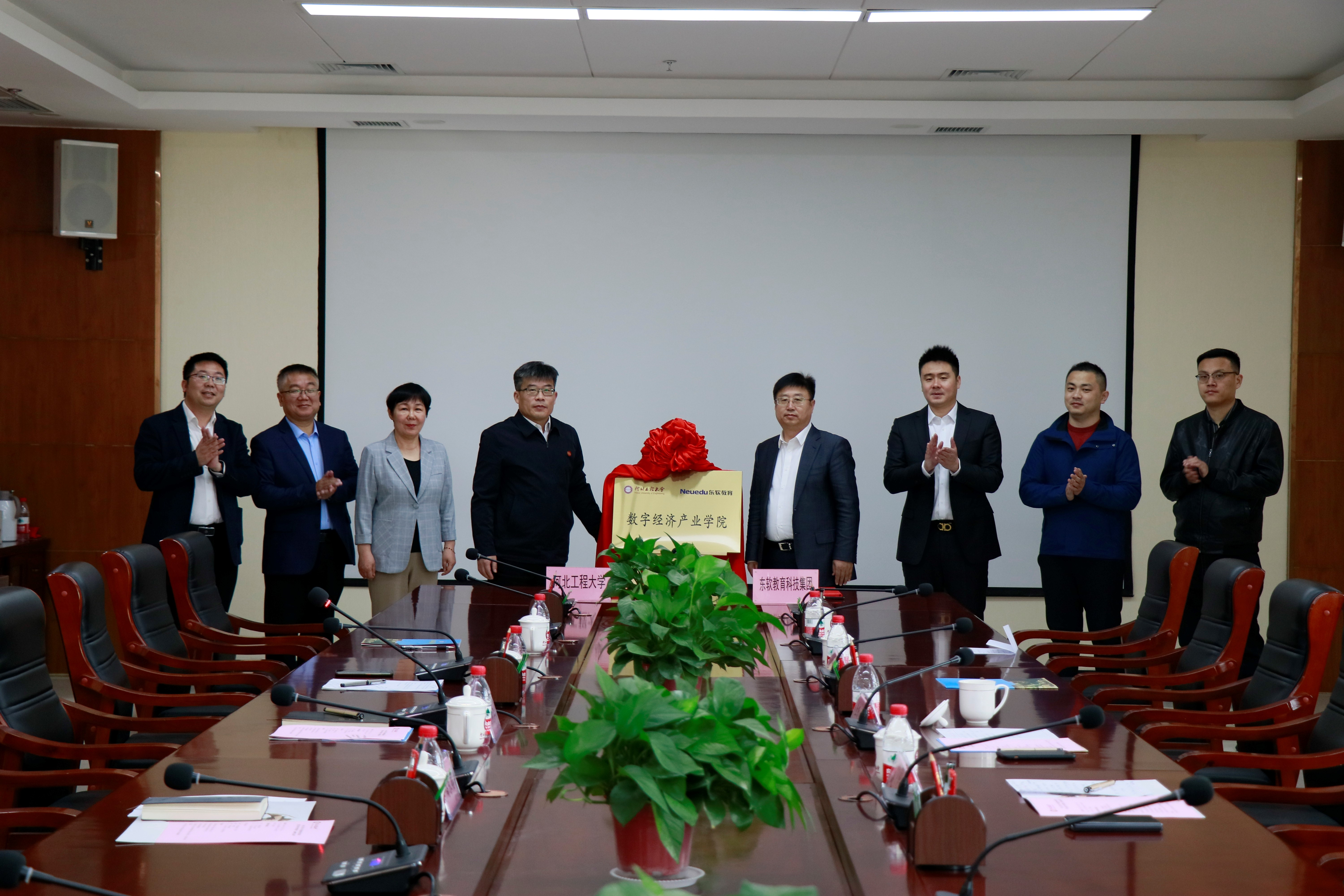 29 March 2023, Dalian - Neusoft Education Technology Group Co. Limited ("Neuedu" or "the Group") and Hebei University of Engineering ("HUE") held a signing and unveiling ceremony for the deep collaboration in building Digital Economy Industry College. YU Shujiang, deputy secretary of the Party Committee and president of HUE, WU Guoying, vice president of Hebei Engineering University, GAO Yongge, director of the Teaching Affairs Office, and WANG Chao, dean of the School of Information and Electrical Engineering, attended the ceremony. LI Yingao, senior vice president of Neuedu, ZHAO Long, general manager of North China Region, and GUO Shuai, sales director of Higher Education Business in North China Region, also attended the ceremony.