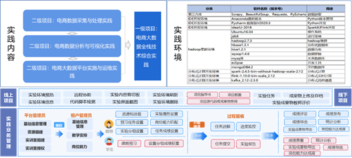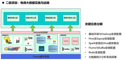 实训室配套二级项目基于高校大数据人才培养目标,对标目标岗位数据采集与处理工程师、大数据分析与可视化工程师、大数据实施与运维工程师的专业技术能力需求,旨在帮助学生夯实工程实践能力和提升岗位就业能力。