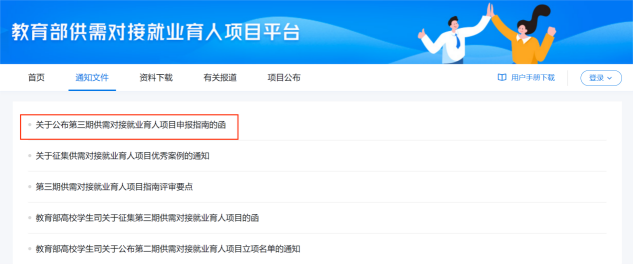 在教育部供需对接就业育人平台(http://www.ncss.cn/jyyr/)“通知文件”栏目,查看项目申报指南。
