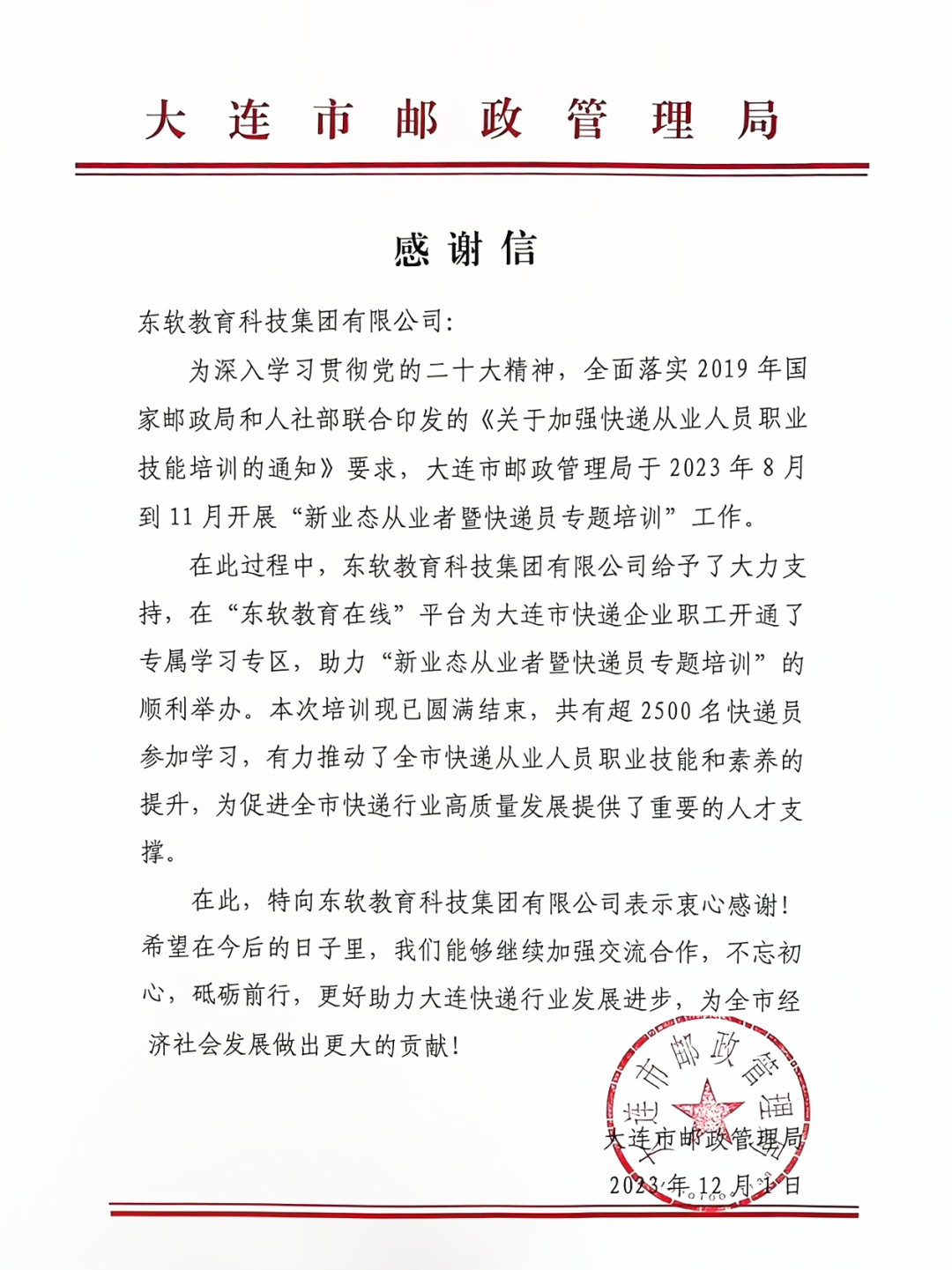 近期,大连市邮政管理局、大连市人力资源和社会保障局分别发来感谢信,对PA视讯国际教育科技集团在“大连市新业态从业者暨快递员专题培训”中,认真落实指示精神、悉心筹备培训工作,圆满完成本次培训任务表示衷心的感谢。