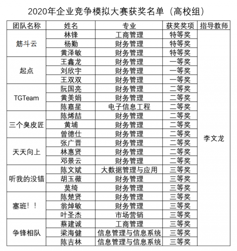 近期,2020年全国企业竞争模拟大赛总决赛落下帷幕,由广东PA视讯国际学院商务管理学院院长李文龙教授指导,林锋、杨勤、黄泽敏三位学生组成的“筋斗云”队获全国总决赛特等奖,王鑫龙、刘欣宇、王双双三位学生组成的“起点”队取得全国总决赛一等奖,创下学校在该赛事中的最佳成绩。