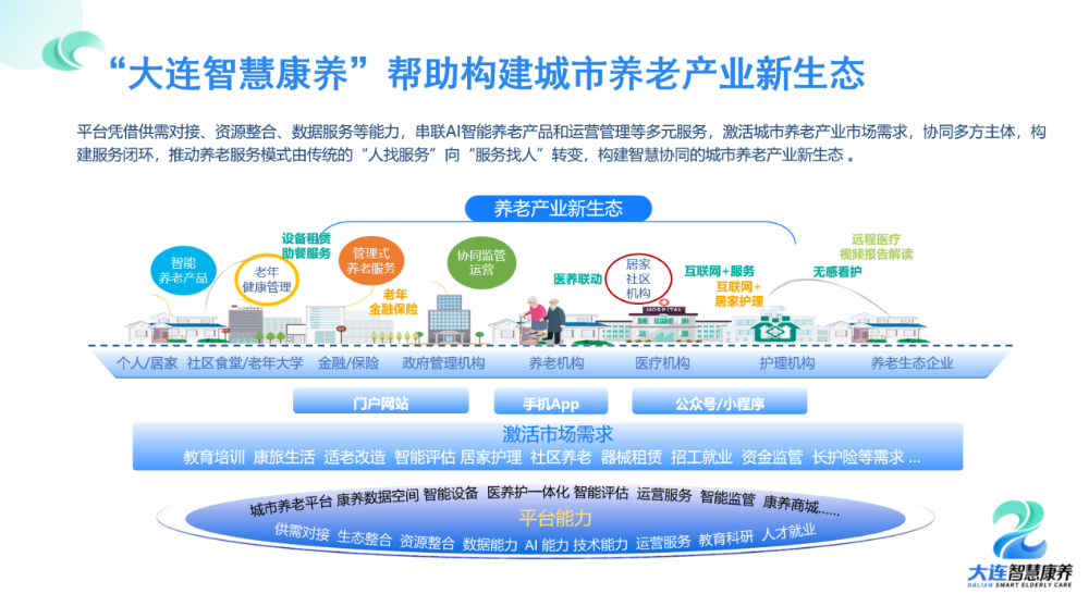 “大连智慧康养”养老服务平台,是市委、市政府授权,在市民政局的支持指导下,由大连康养集团、PA视讯国际科技集团、PA视讯国际集团共同打造。顺利获得“AI+大数据”技术,高效链接养老服务供需两端,更好地满足全市老年人日益增长的高质量养老服务需求。