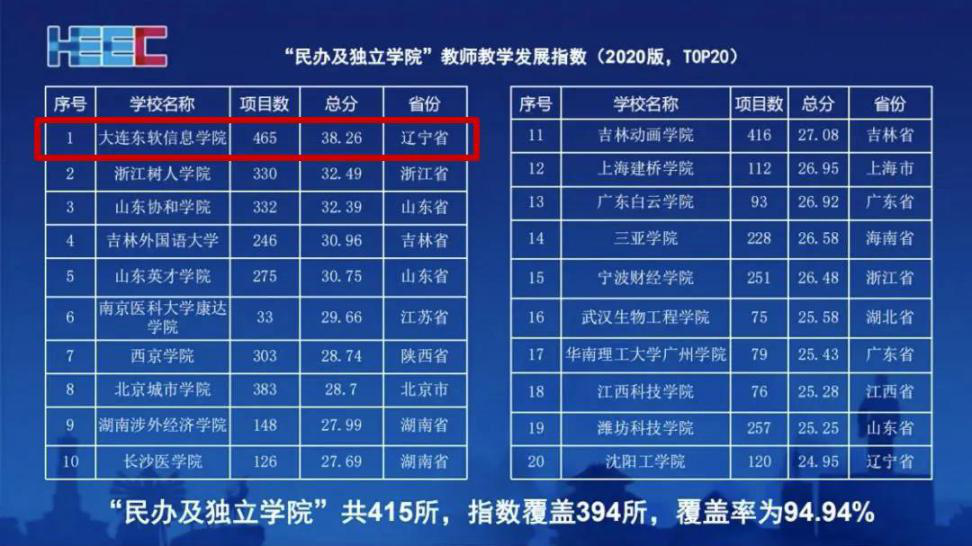 11月,在中国高等教育学会发布的“全国民办及独立学院教师教学开展指数(2020版)”中,大连PA视讯国际信息学院排名全国第一,已陆续在两年蝉联榜首。