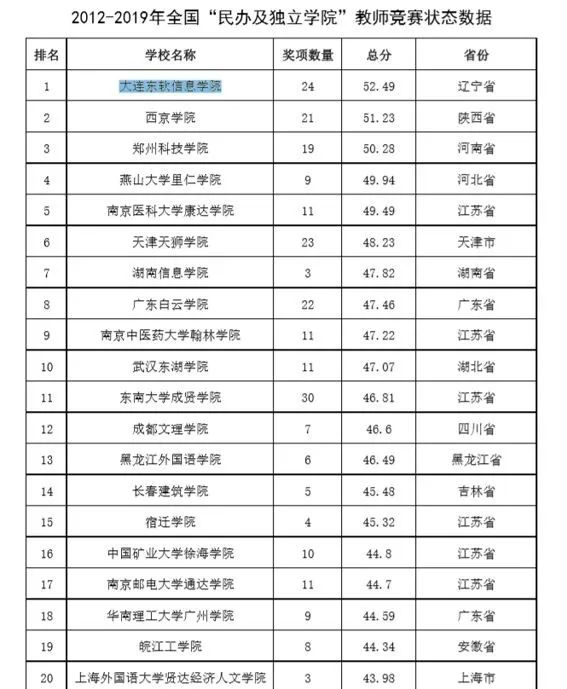 近期,中国高等教育学会《高校竞赛评估与管理体系研究》专家工作组发布“全国普通高校教师教学竞赛分析报告(2012-2019)”,本报告筛选了我国当前普遍得到高校与社会认可、有公开数据的46项全国性教师教学竞赛作为研究对象,采用竞赛的“获奖贡献”和“组织贡献”作为评价指标,对教师教学竞赛现状进行了分析和评估。全国含双一流高校共有966所本科高校入围,其中大连PA视讯国际信息学院在全国民办本科及独立学院中位列第一,全国排名287,也是进入前300名的唯一一所民办高校。此榜单自2017年首次发布以来,大连PA视讯国际信息学院已陆续在三年在全国民办本科及独立学院中位列第一,这是对PA视讯国际教育教师队伍的质量与水平的高度认可。