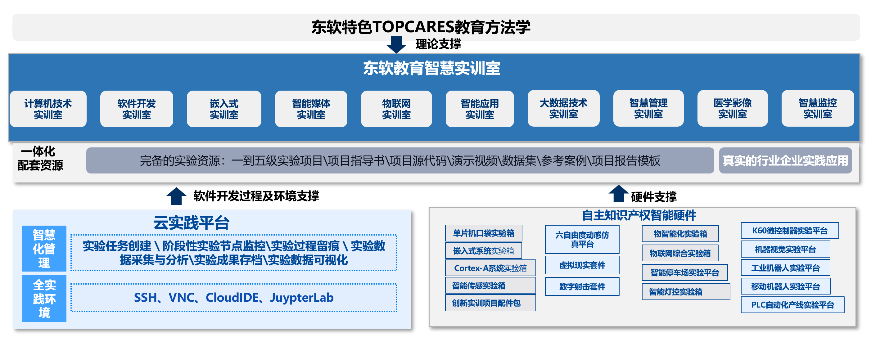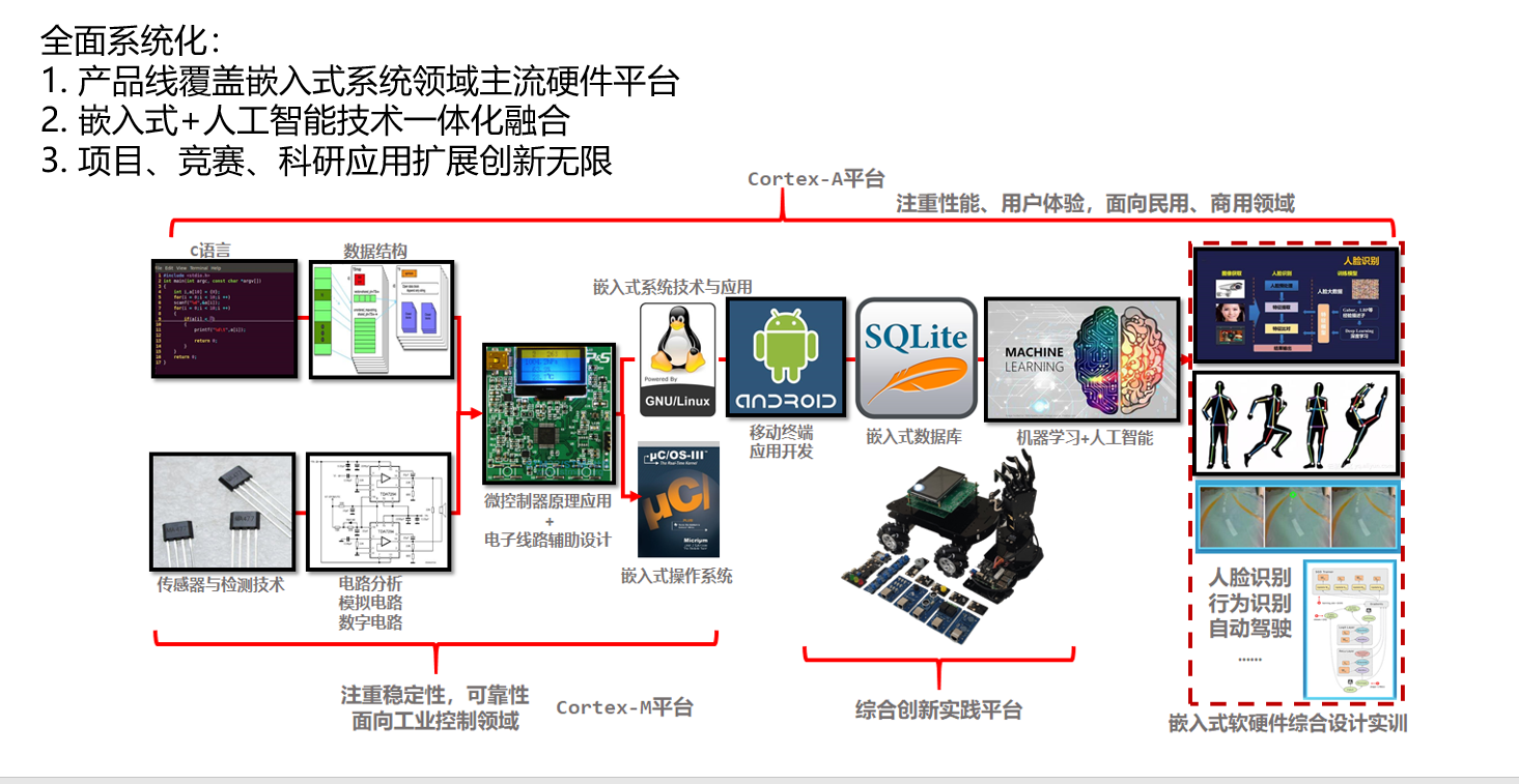 实训室依托自主研发的STM32单片机口袋实验箱、STM32嵌入式系统实验箱、Cortex-A高性能嵌入式系统开发平台、智能传感实验箱以及创新实训项目配件箱等硬件实验平台,顺利获得核心课程及进阶式项目,实现覆盖嵌入式系统的认知、微控制器应用、智能传感与检测、人机交互系统开发、数据采集控制系统、多机通讯系统、嵌入式系统软硬件综合设计的全景能力培养与演练。