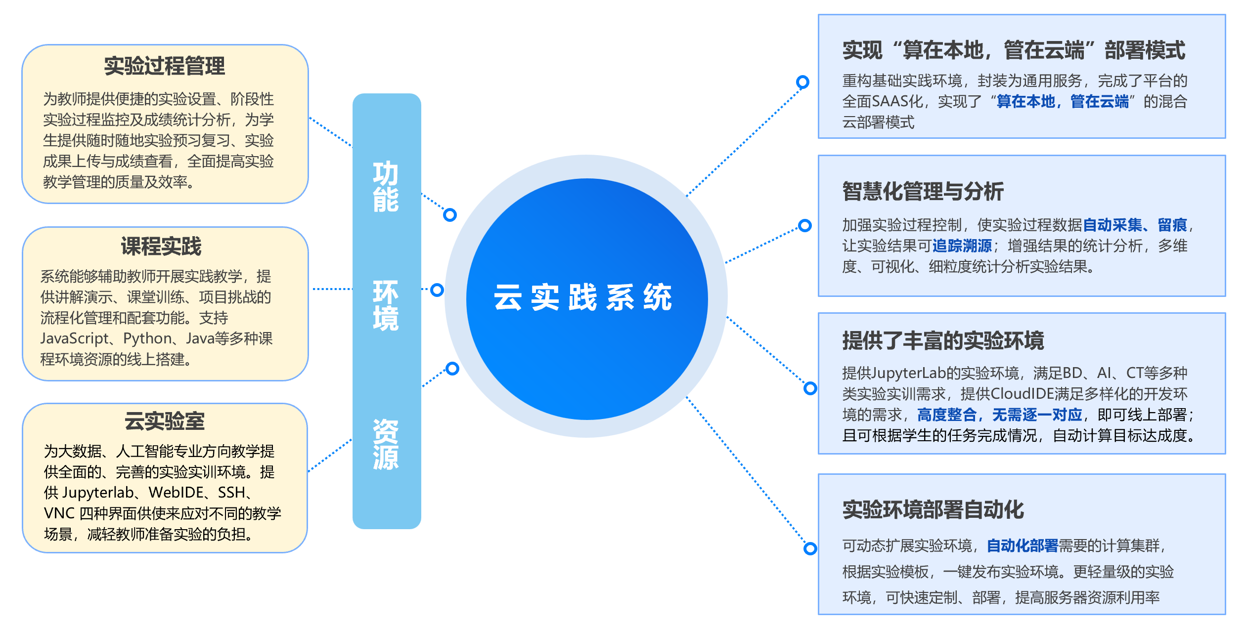 整合后的云实践系统实现了“算在本地,管在云端”部署模式,给予智慧化管理与分析,建立了丰富的实验环境,同时实现环境部署的自动化,充分满足实践需求。