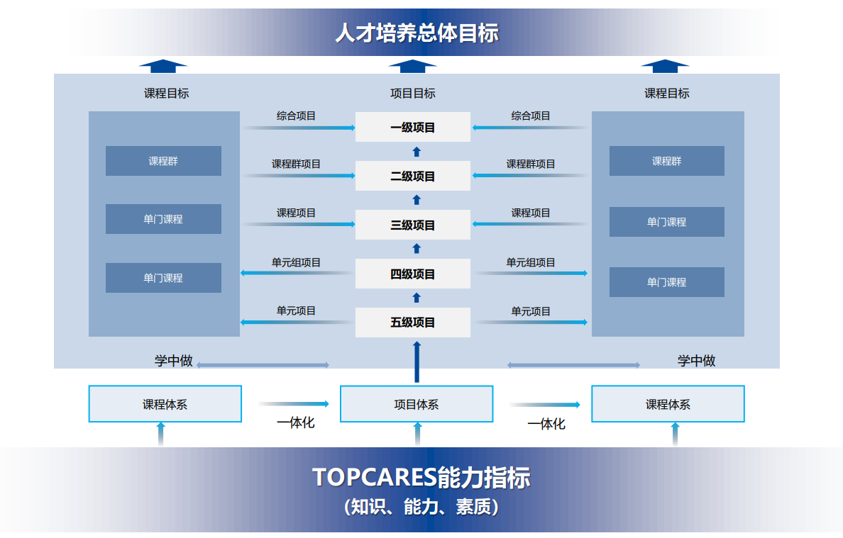 以能力为导向以项目为牵引打造一体化实践教学体系。根据真实生产、服务的技术和流程,对各专业课程体系结构、内容和次序进行重新设计,构建了能力导向、五级项目牵引、内容动态更新的一体化实践教学体系,实现: